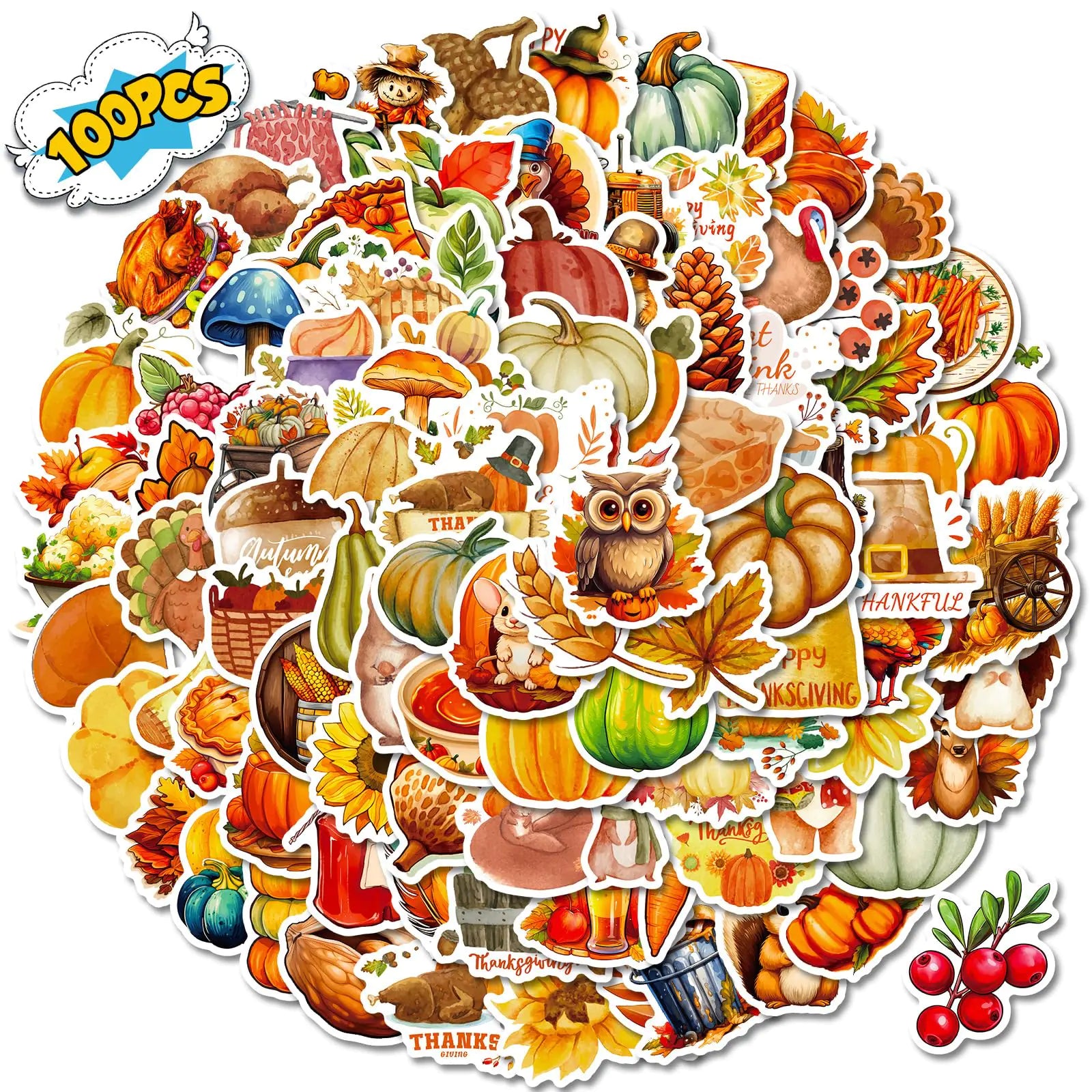 100PCS Fall Thanksgiving Stickers Bundle Fun Turkey Pumpkin Styles for Kids Premium Waterproof Vinyl for Water Bottle Decoration Card Crafts Scrapbooking and Harvest Celebrations