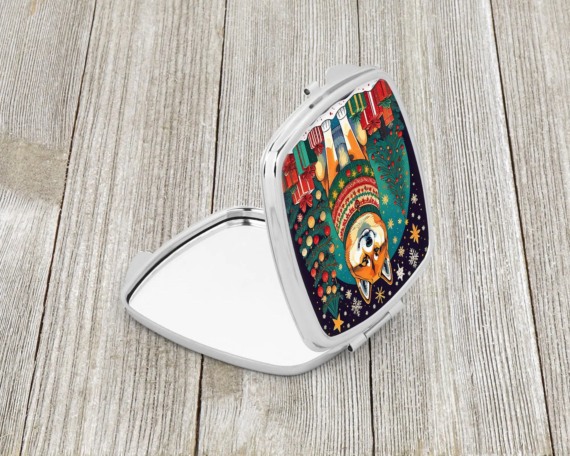 Compact Mirror featuring breed specific Akita artwork. Celebrate Christmas with this Christmas Compact Mirror. Introducing our Square Compact Mirror, a blend of elegance, functionality, and compactness, perfect for on-the-go touch-ups. This Silvertone metal mirror, with dimensions of 2.75 inches x 3 inches x .3 inches, fits effortlessly into your purse, handbag, or pocket, ensuring that you can check your appearance anytime, anywhere. Our compact mirror stands out with its eye-catching artwork on the front, adding a dash of style to this practical accessory. It is more than just a mirror; it's a statement piece that reflects your personality and aesthetic. When opened, this compact reveals two mirrors inside, doubling your perspective for precise touch-ups. The Silvertone metal construction ensures durability while maintaining a lightweight feel, making it an ideal everyday carry item. Whether you're rushing to a meeting, prepping for a dinner date, or just need a quick check on your look, our Square Compact Mirror is your reliable companion. Experience the perfect blend of style and practicality with this must-have accessory.