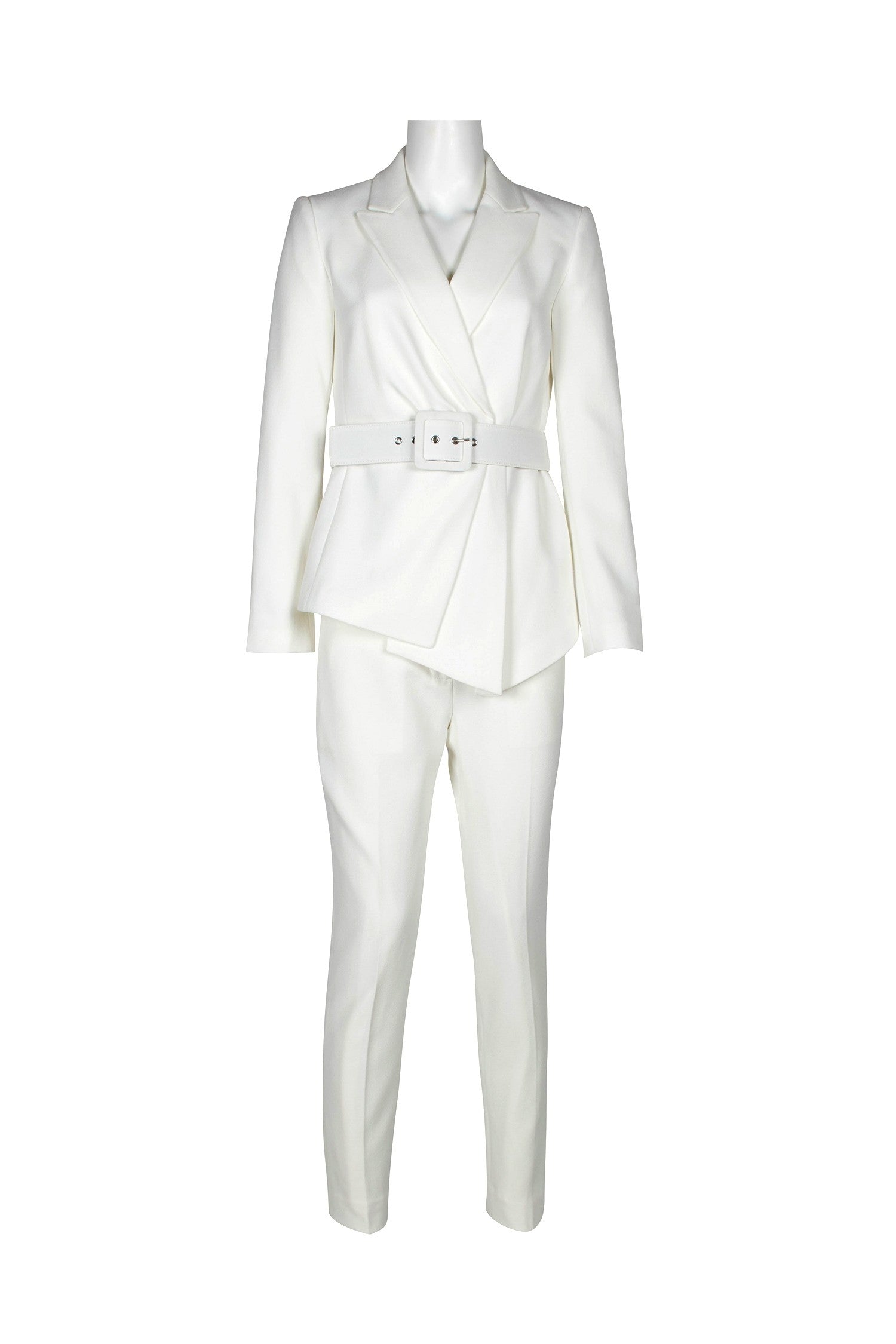 Tahari ASL Notched Collar Long Sleeve Pleated Belted Crepe Pants Suit