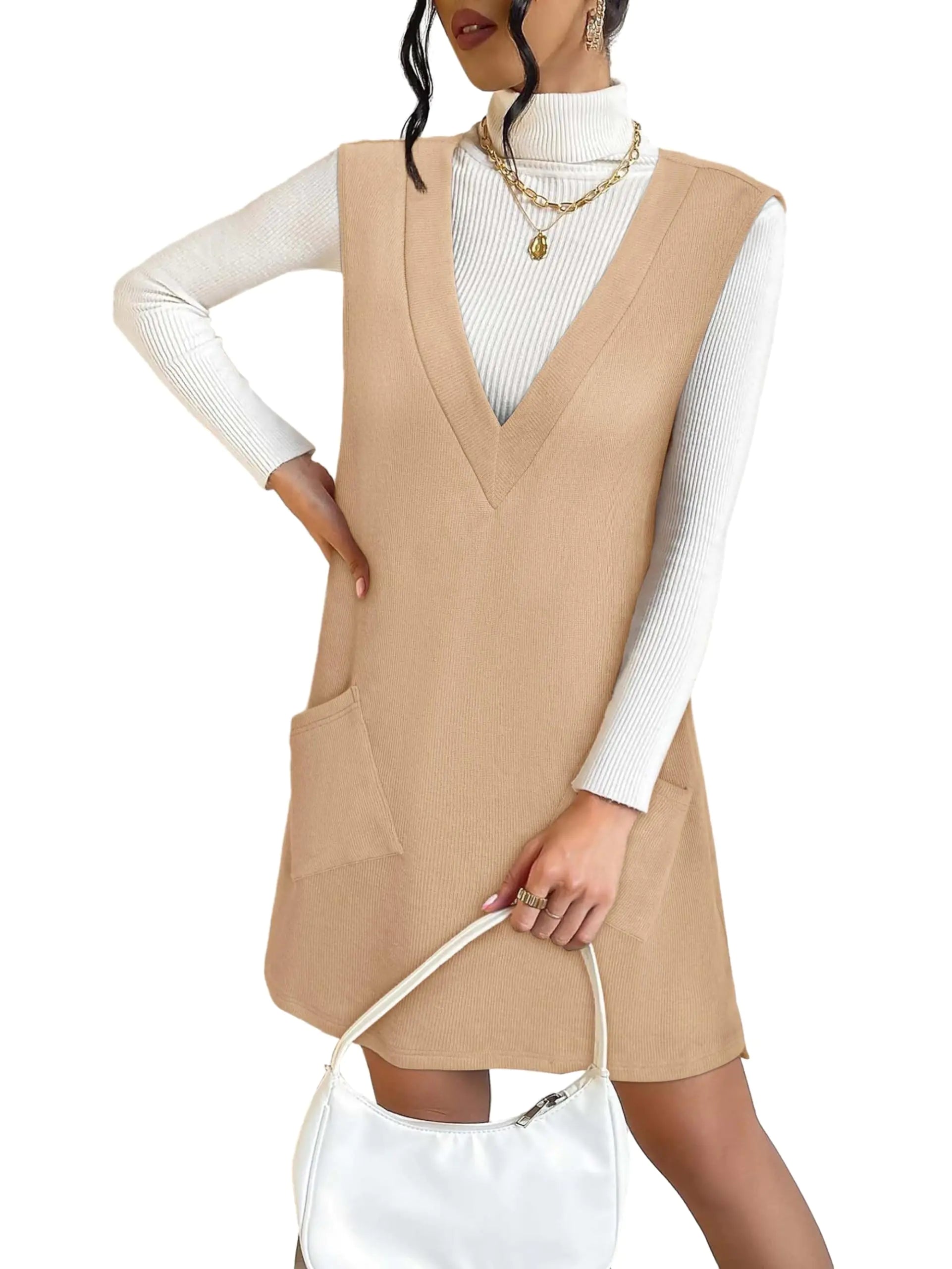 [【Material】This sleeveless V-neck knitted sweater vest dress is crafted from 100% skin-friendly and soft polyester fabric providing exceptional comfort and breathability. The thanksgiving dress and casual style ensures a comfortable fit for all body shapes with no uncomfortable clinging or shrinking making it a cozy choice as a winter dress or sweater vest for layering. 【Features】This V-neck sweater dress features a sleeveless design a relaxed fit and an easy pullover style. With its solid color and swing A-line hem that offers full coverage for the hips and rear it’s ideal as a winter dress over leggings. Two side pockets add convenience letting you carry essentials like keys lipstick or a phone. 【Matching】Perfect for fall and winter this knit dress pairs effortlessly with shirts tees blouses jeans or leggings allowing you to create a playful yet sophisticated look. Its elegant design makes it suitable for a variety of occasions including casual wearChristmas,thanksgiving work clubs school home holiday or even as a cozy yet chic outfit for a winter wedding. 【Gift Idea】The loose modest style of this dress covers the crotch abdomen and buttocks making it especially flattering for pear-shaped body types. Perfect for fall and winter wear this sweater vest can be layered with a long-sleeved shirt underneath and a jacket on top for added warmth making it a thoughtful and stylish gift for thanksgiving family and friends. 【Easy Care】This sweater vest dress is easy to care for whether dry cleaned or machine washed in a laundry net bag to retain its shape and durability. The easy-care design ensures long-lasting enjoyment of this versatile fashion-forward piece.]